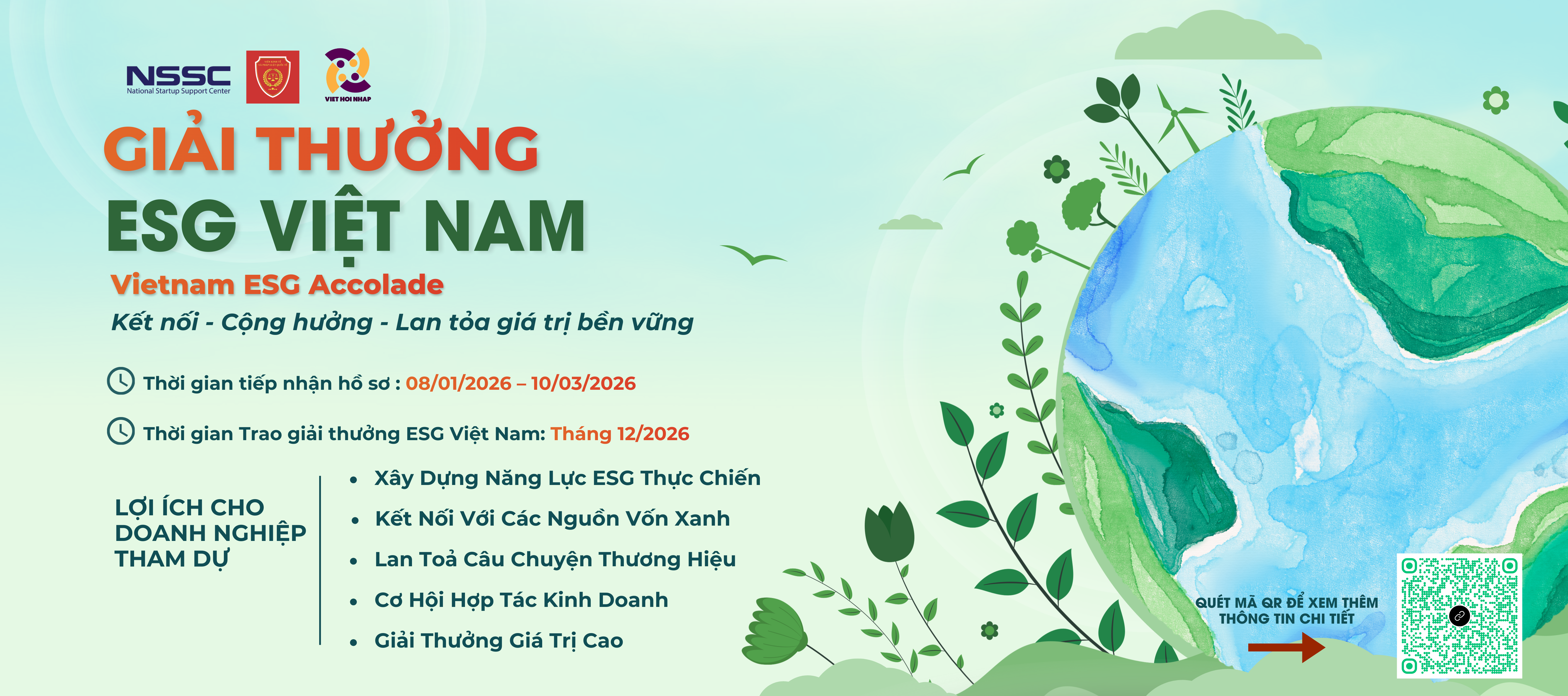 Chương trình ”Giải thưởng ESG Việt Nam” là một sáng kiến chiến lược được khởi xướng bởi Công ty Phát triển Nguồn nhân lực Việt Hội Nhập và đồng thực hiện cùng các đối tác liên quan như Cục Khởi nghiệp và Doanh nghiệp công nghệ (NATEC), Trung tâm Hỗ trợ Khởi nghiệp Sáng tạo Quốc gia (NSSC), Viện Kinh tế & Pháp luật Quốc tế,… Giải thưởng được thiết kế như cầu nối giữa mục tiêu tăng trưởng xanh của Chính phủ Việt Nam với cộng đồng doanh nghiệp. Đây là bệ phóng để doanh nghiệp Việt Nam không chỉ tuân thủ, mà còn chủ động dẫn dắt xu thế kinh doanh bền vững.